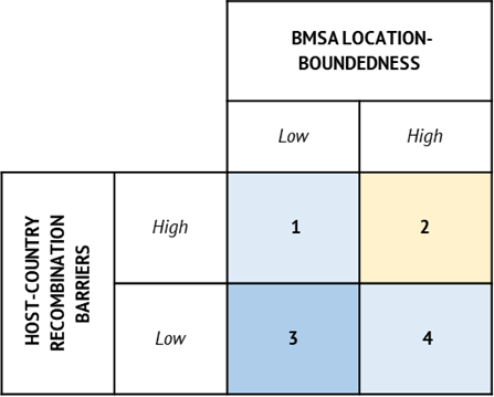 The combination of BMSA transferability and recombination barriers creates four options for the success potential of internationalization (see Figure 2).